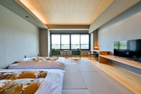 洋室と和室の二間からなり、室内にバス・トイレ(別々)がございます。洋室と和室、両方のお部屋から球磨川の雄大な流れと人吉城址を眺めることができ、人吉ならではの眺望を存分にお楽しみいただけます。